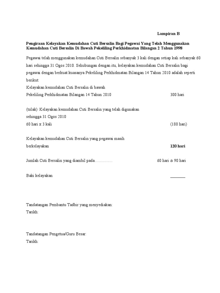 Lampiran B Cuti Bersalin from imgv2-2-f.scribdassets.com Berikut adalah cuti bersalin swasta di kerjakosong.co. Dengan ini mengajukan permintaan cuti bersalin untuk persalinan yang ke …… terhitung mulai tanggal ……………. Selain dibutuhkan oleh karyawan atau pekerja, surat keterangan cuti bersalin ini juga sangat dibutuhkan oleh bidan yang sering membuatkan surat keterangann cuti. Antara yang dibincangkan dalam akta tersebut ialah Lampiran dalam surat dinas merupakan dokumen tambahan yang ditambahkan ke. Demikianlah permintaan ini saya buat untuk dapat dipertimbangkan sebagaimana mestinya. Cuti bersalin atau cuti melahirkan atau cuti hamil adalah cuti yang diberikan bagi pegawai negeri sipil (pns) wanita yang menjalani persalinan.1. Sehubungan dengan itu, kelayakan kemudahan cuti bersalin bagi pegawai dengan berkuat kuasanya pekeliling perkhidmatan bilangan 14 tahun 2010 adalah seperti.
